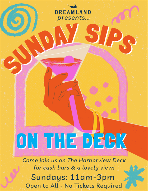 Spend Sunday afternoons lounging on the Dreamland's Harborview Deck, enjoying beautiful views of the Harbor! Access is free to the public! The Harborview Deck will be open 11am to 3pm, with a cash bar for those who'd like to "Sip"! Weather Permitting, of course.