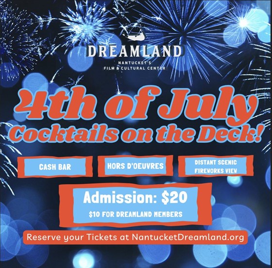 Get away from the crowded streets and beaches on the Fourth of July and join us on the Harborview Deck for some sips (cash bar) and complimentary lite bites from 6:30-9:30pm. You’ll also be able to enjoy (distant) views of the 9pm fireworks display from off Jetties Beach. Dreamland Members & Summer Dream Pass Holders enter for $10 and tickets for the general public are just $20 and Kids 12 and under are FREE with a ticket! Become a Dreamland member today! Memberships allow the Dreamland to stay open year round. Members pay no service fees, receive discounted tickets, free popcorn and free entry to special screenings and events. Become a Dreamland Member today!