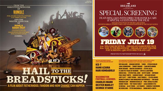 Join us for a very special screening of HAIL TO THE BREADSTICKS: HOW ONE WHITE GUY SOLVED RACISM! (A Film About Fatherhood, Football, and Fandom) at The Dreamland featuring a welcome reception in the Harborview Room & Deck with a cash bar, beginning at 6:30pm, open to all ticketholders. The movie screens at 8pm followed by a very special Q&A.You’ll get the opportunity to meet director Donick Cary as well as some of the Native American visiting guests featured in the film. They include: Kenneth Shirley of the Navajo Nation, Dominic Pablo of the Navajo Nation, Nanabah Kadenehii of the Navajo Nation, and Amayah Little Wolf of the Red Lake Nation. Ticket proceeds from the event will benefit both The Dreamland and Musack.org.