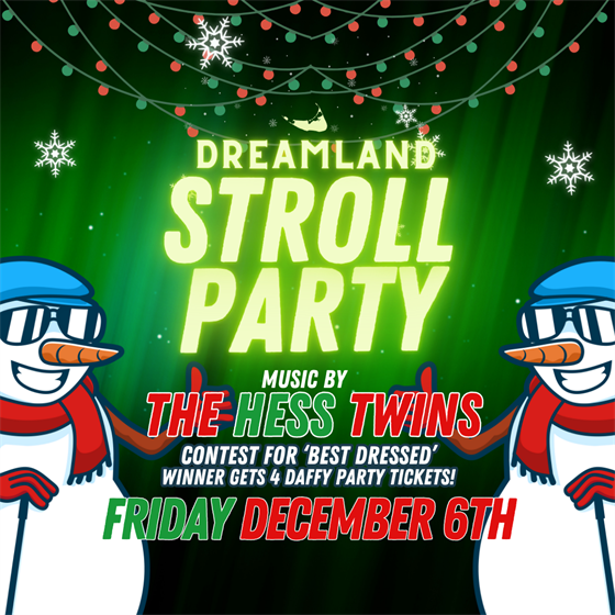 Join us for the fourth annual Dreamland Stroll Party on the second floor of The Dreamland. The well-known DJ duo the Hess Twins will be performing your favorite top 40, classic, and holiday hits to dance the night away to!